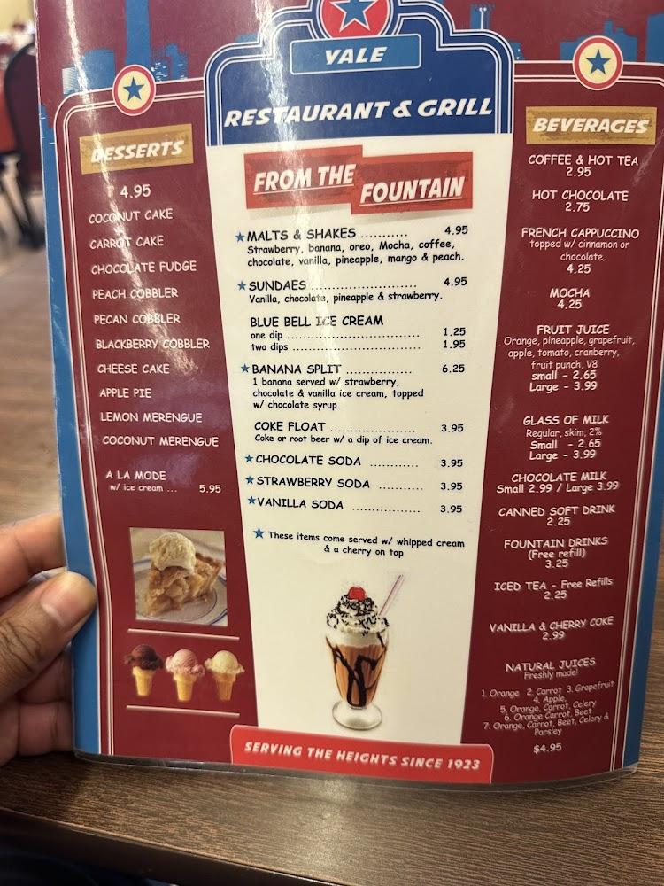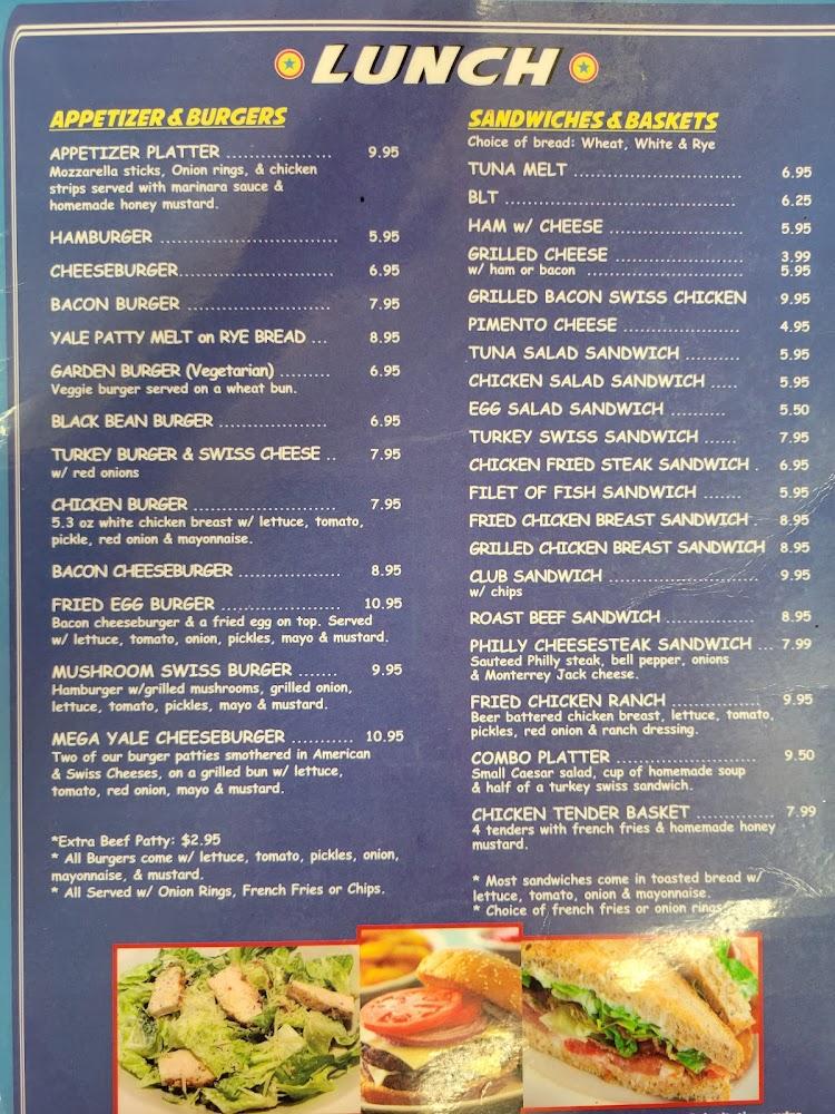 Lunch and dinner highlight a variety of sandwiches and burgers, including the well-known Yale patty melt. Sides like crispy onion rings and sweet potato fries complete the experience. Kids will delight in favorites such as chicken strips and grilled cheese.